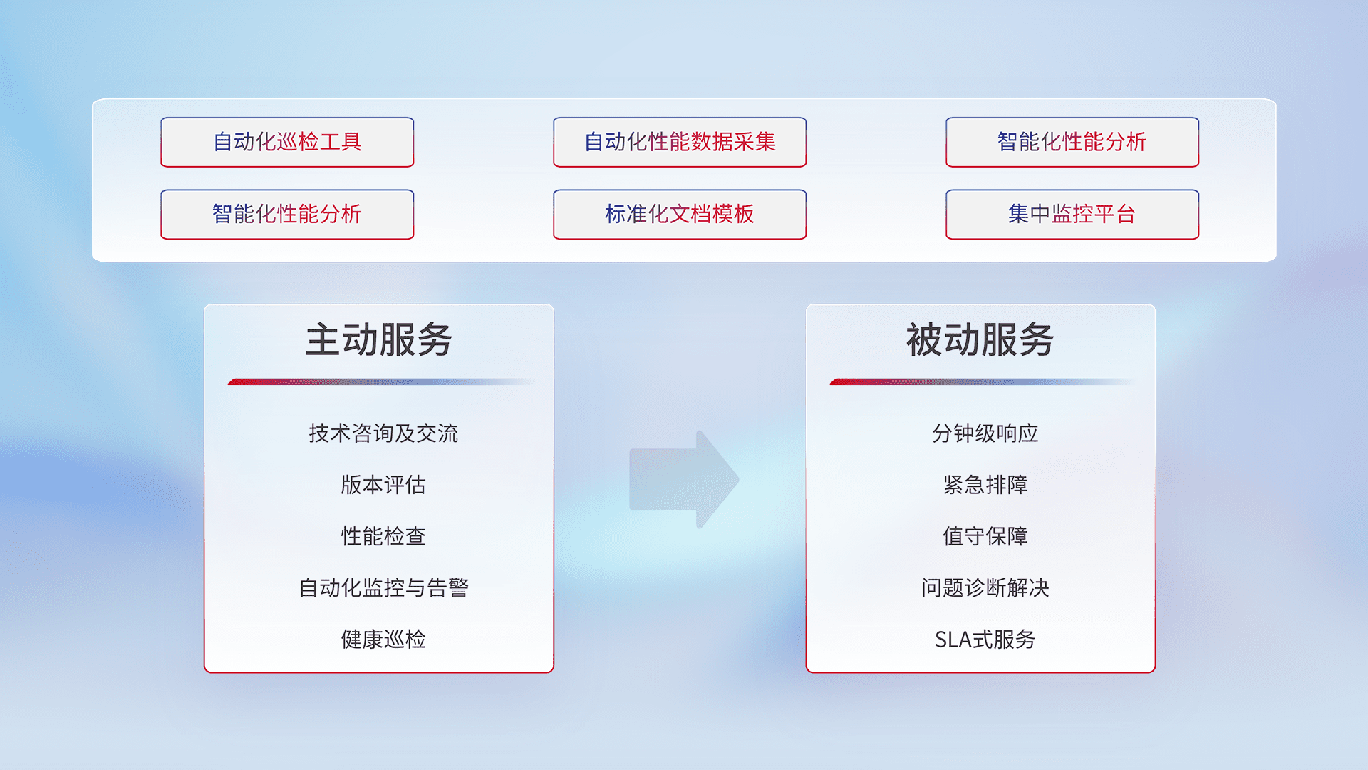 智能化工具和标准化文档,,,,保障服务质量,,,,提供主动服务(包含技术咨询、、、版本评估、、、性能检查、、自动化监控与告警、、、、健康巡检)和被动服务包含(分钟级响应、、、紧急排障、、、、值守保障、、问题诊断解决、、、、SLA服务)。。。
